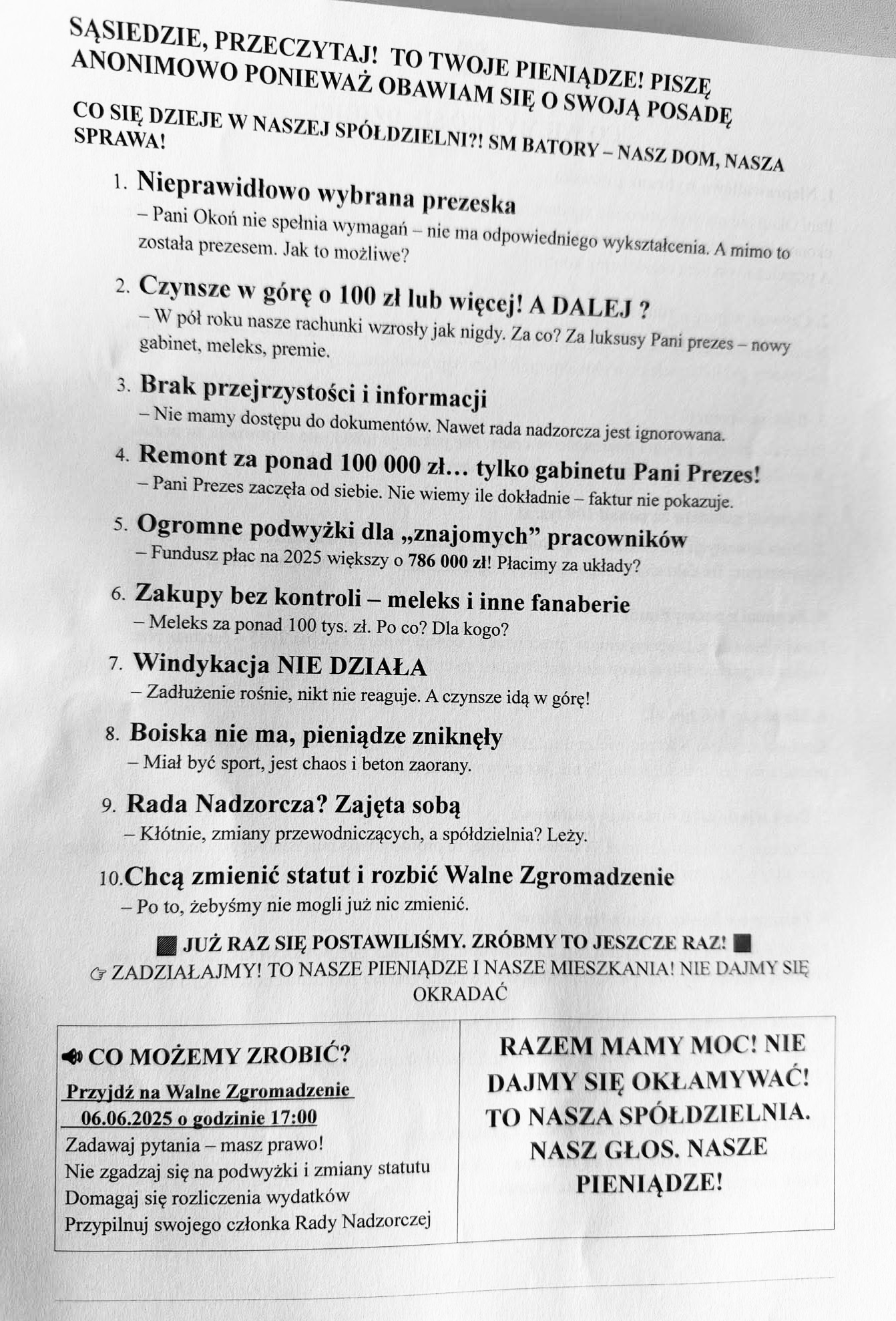 Do skrzynek pocztowych mieszkańców zasobów Batorego, podobnie jak w ubiegłym roku, trafiły anonimy. Ich treść możecie zobaczyć poniżej: