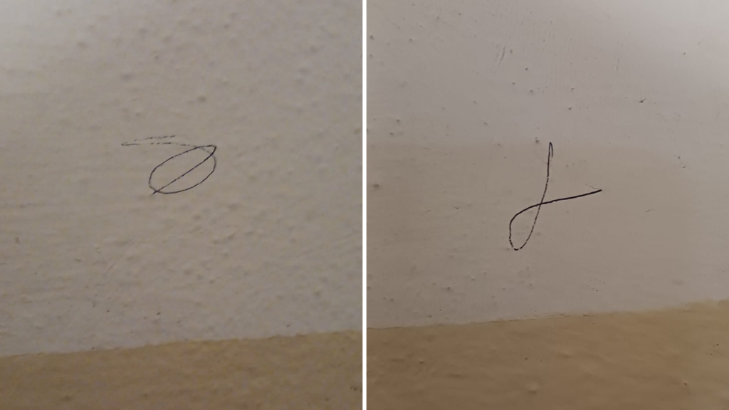 Miałam dokładnie dwa z tych znaków na zdjęciach. Starłam. Na drugi dzień pojawił się napis drobnym druczkiem, chyba w języku angielskim. Szkoda, że nie można dodać zdjęcia. Policja mnie wyśmiała. Zaznaczę, że nie było to pismo dziecięce.