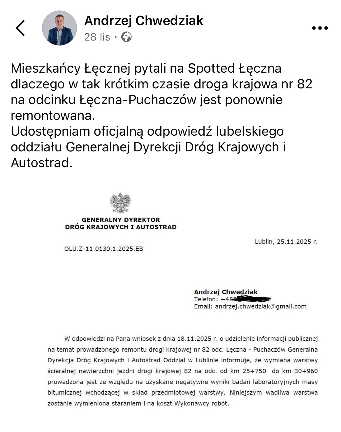 Kres spekulacjom położył Andrzej Chwedziak, który w mediach społecznościowych udostępnił oficjalną odpowiedź z lubelskiego oddziału Generalnej Dyrekcji Dróg Krajowych i Autostrad. W piśmie z 25 listopada br. czytamy, że obecne prace są koniecznością.